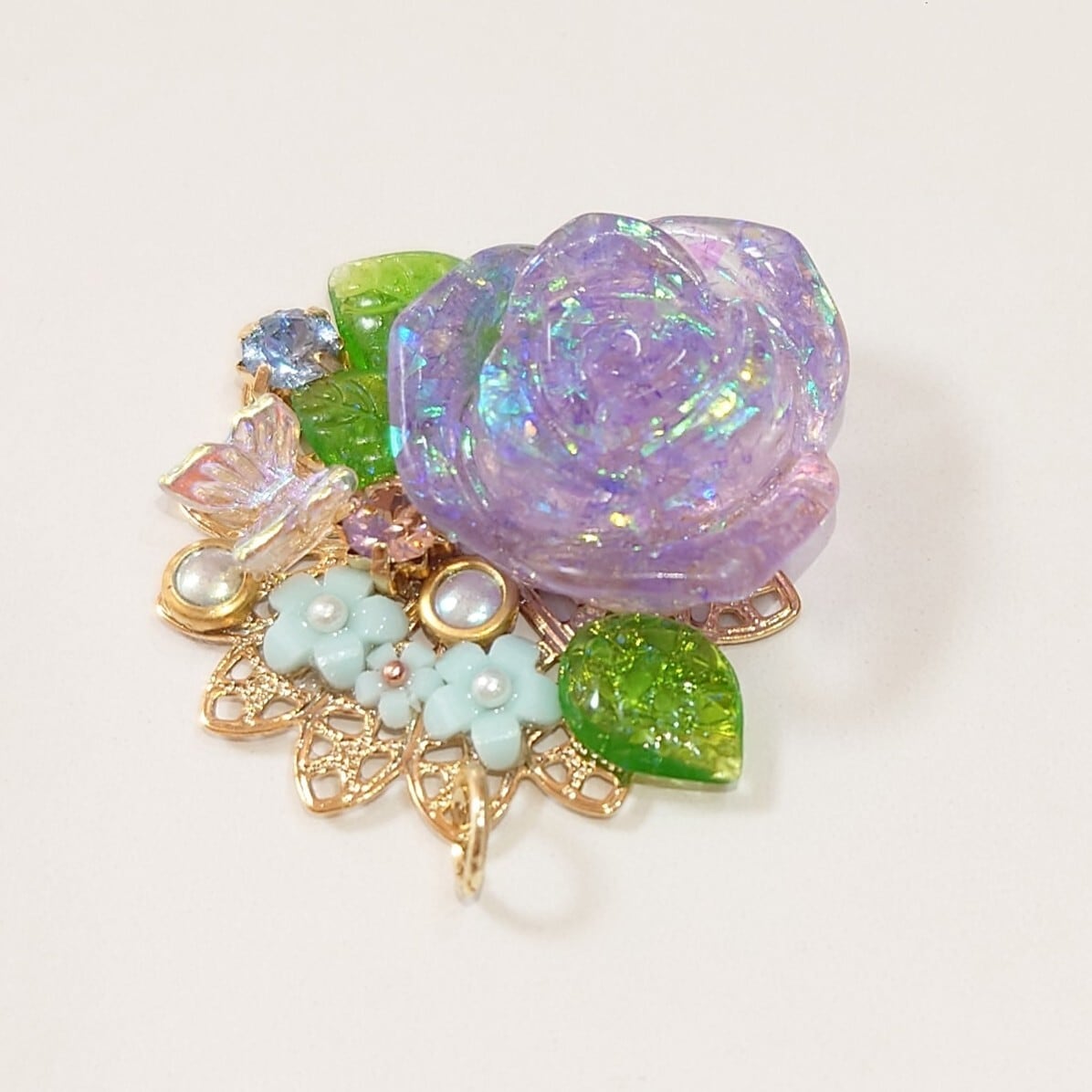 ハンドメイドで作成した紫色が基調のペンダントトップです。神秘的な色合いがあなたのコーディネートに上品なアクセントを加え、特別な存在感を演出します。