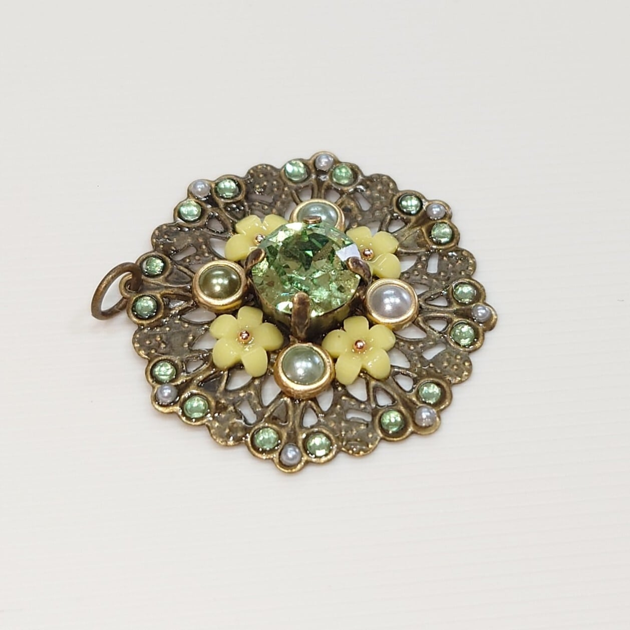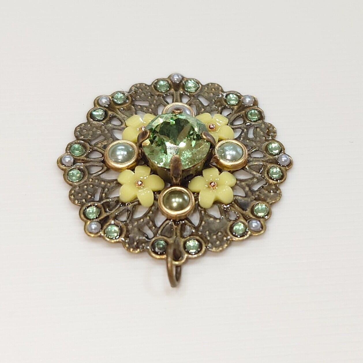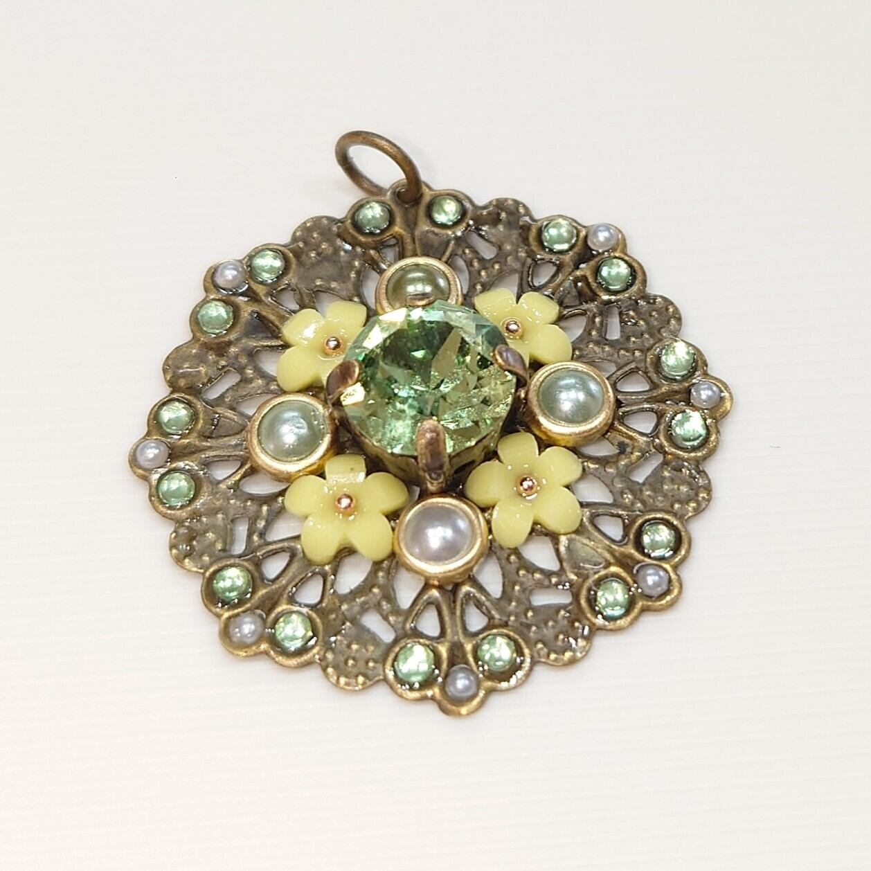 ハンドメイドで作成された、エレガントな緑色のペンダントトップです。上部には便利な丸い金具が付いており、ネックレスはもちろん、キーホルダーや携帯ストラップとしてもご利用いただけます。親しいご友人への贈り物や、自分へのご褒美としてもぴったりな一品です!
