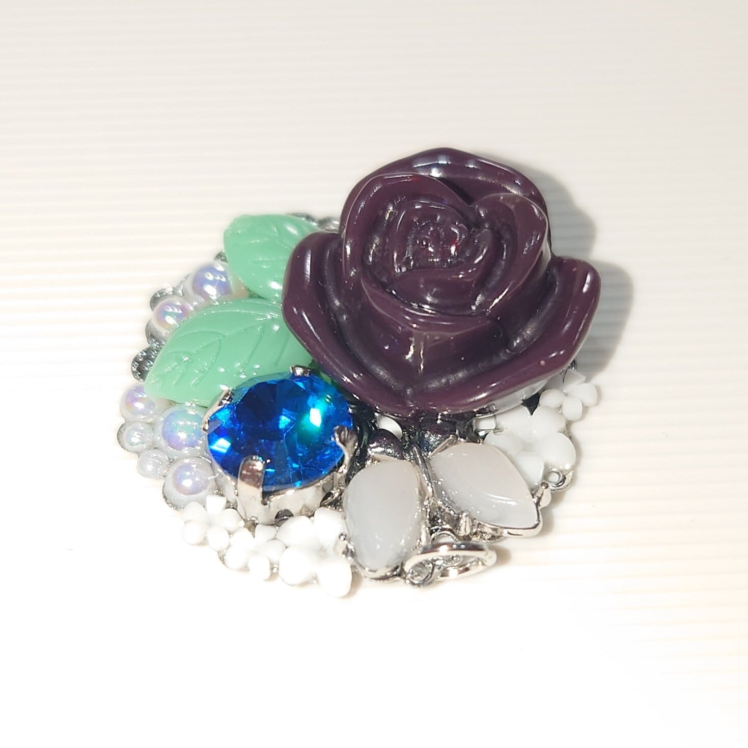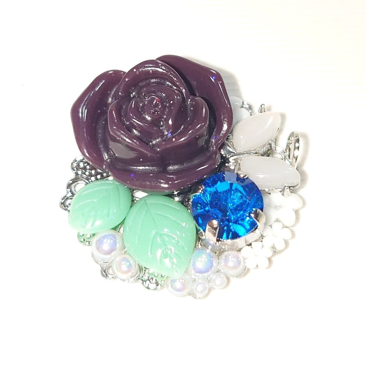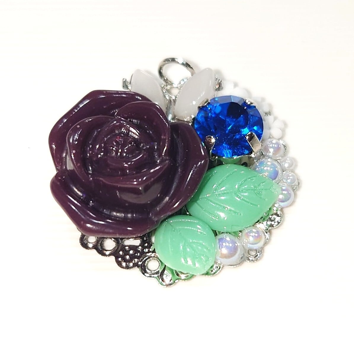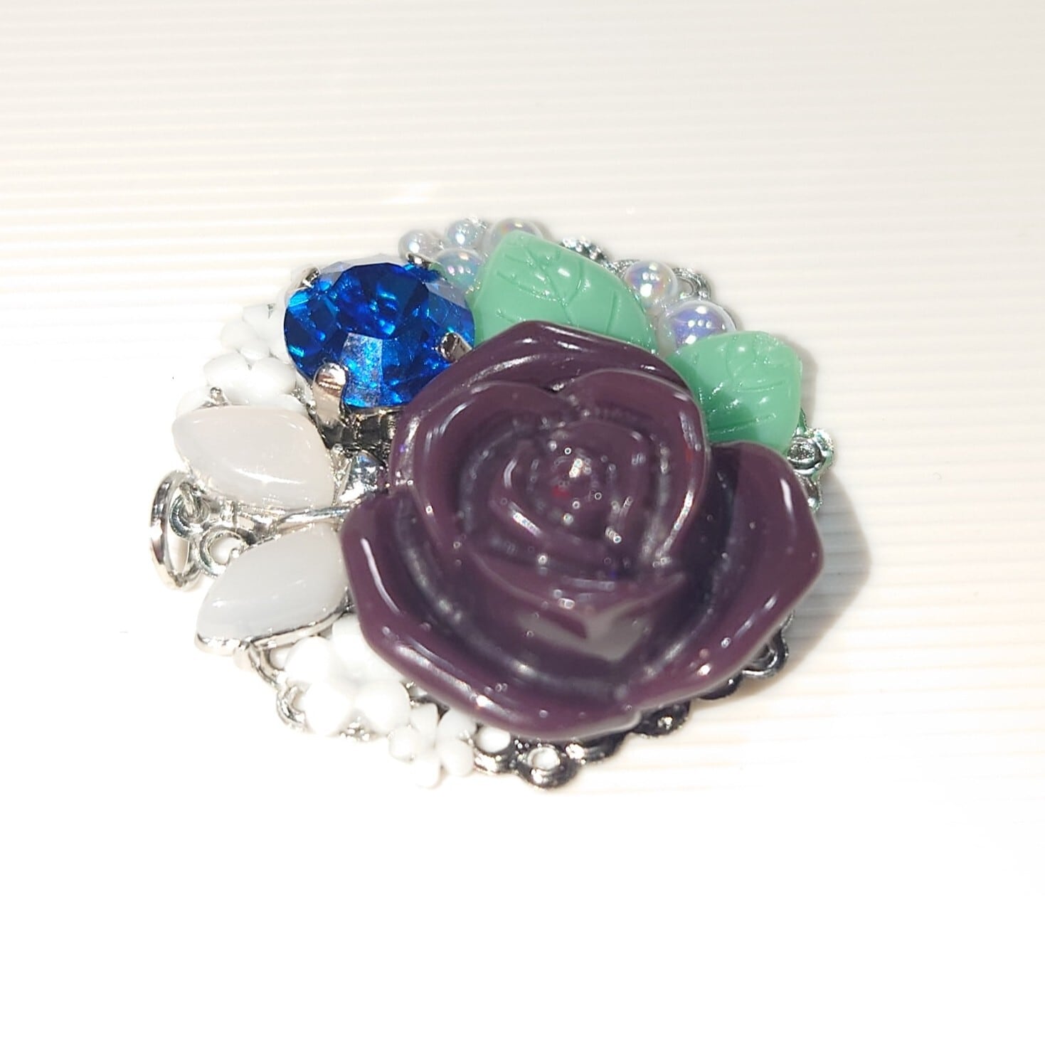 ハンドメイドで作成された、チョコレート色の薔薇を中心にデザインしたペンダントトップです。深みのある色が、あなたのコーディネートに落ち着きと洗練をもたらします。上部には便利な丸い金具が付いており、ネックレスはもちろん、キーホルダーや携帯ストラップとしてもお楽しみいただけます。ご友人や親しい方への贈り物としても最適な一品です!