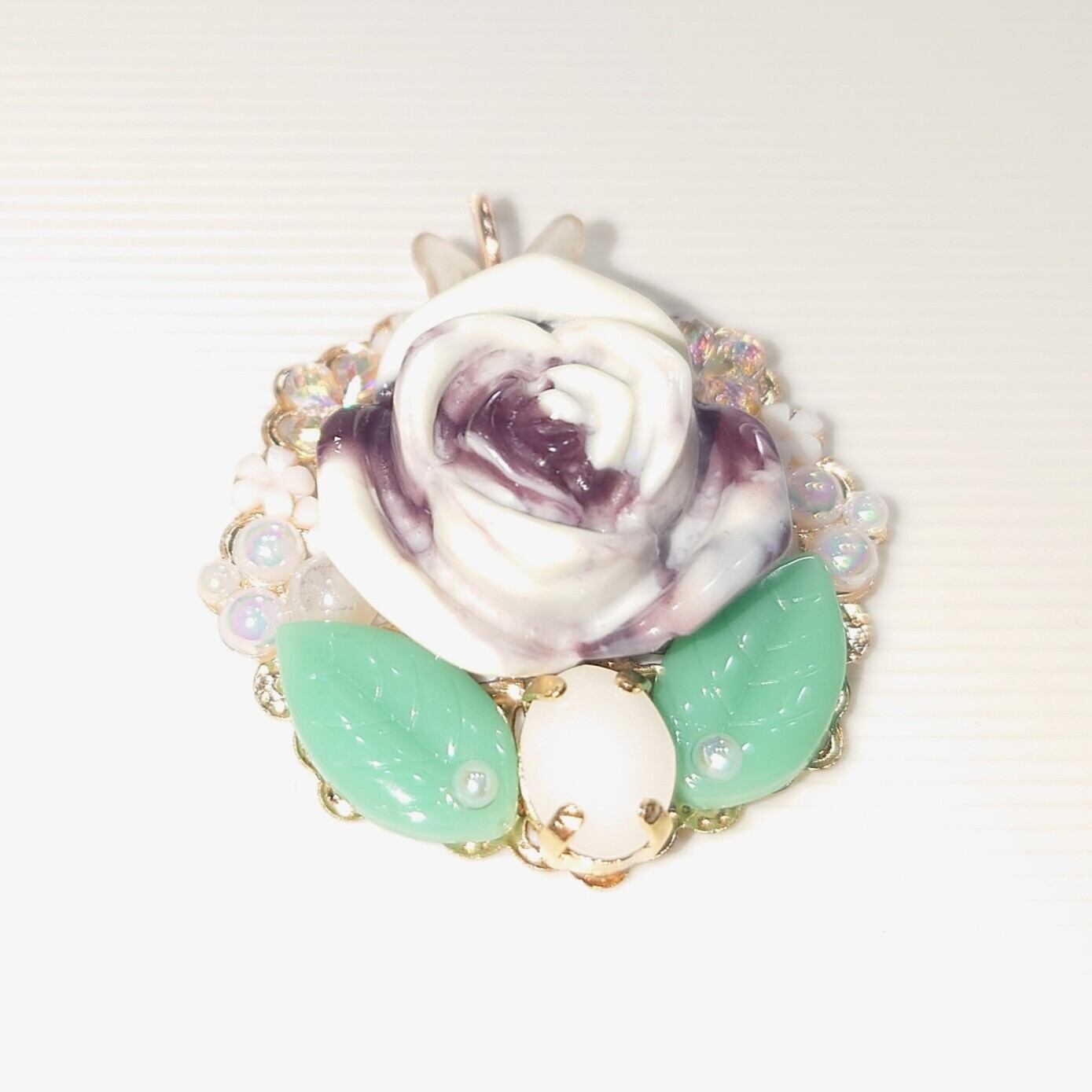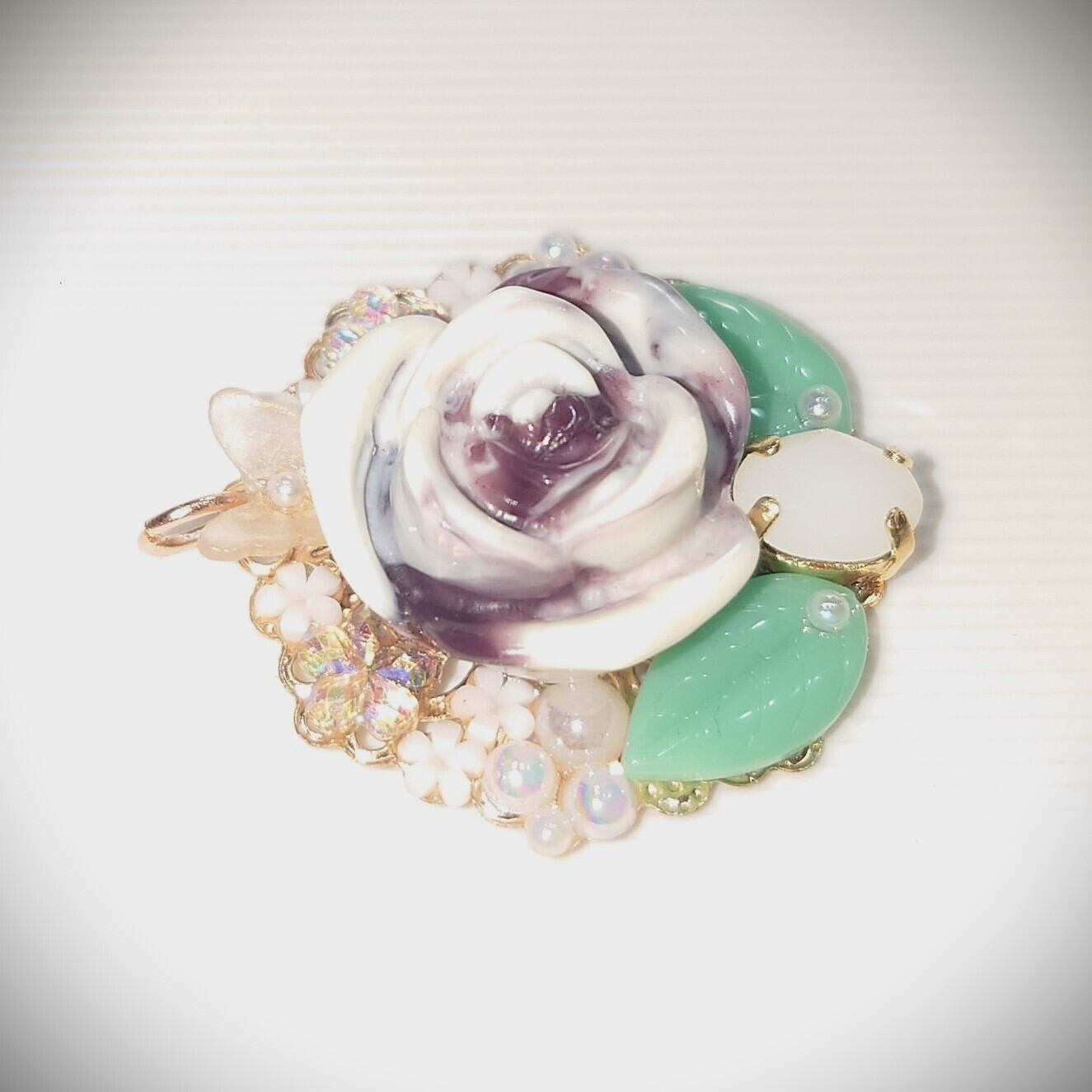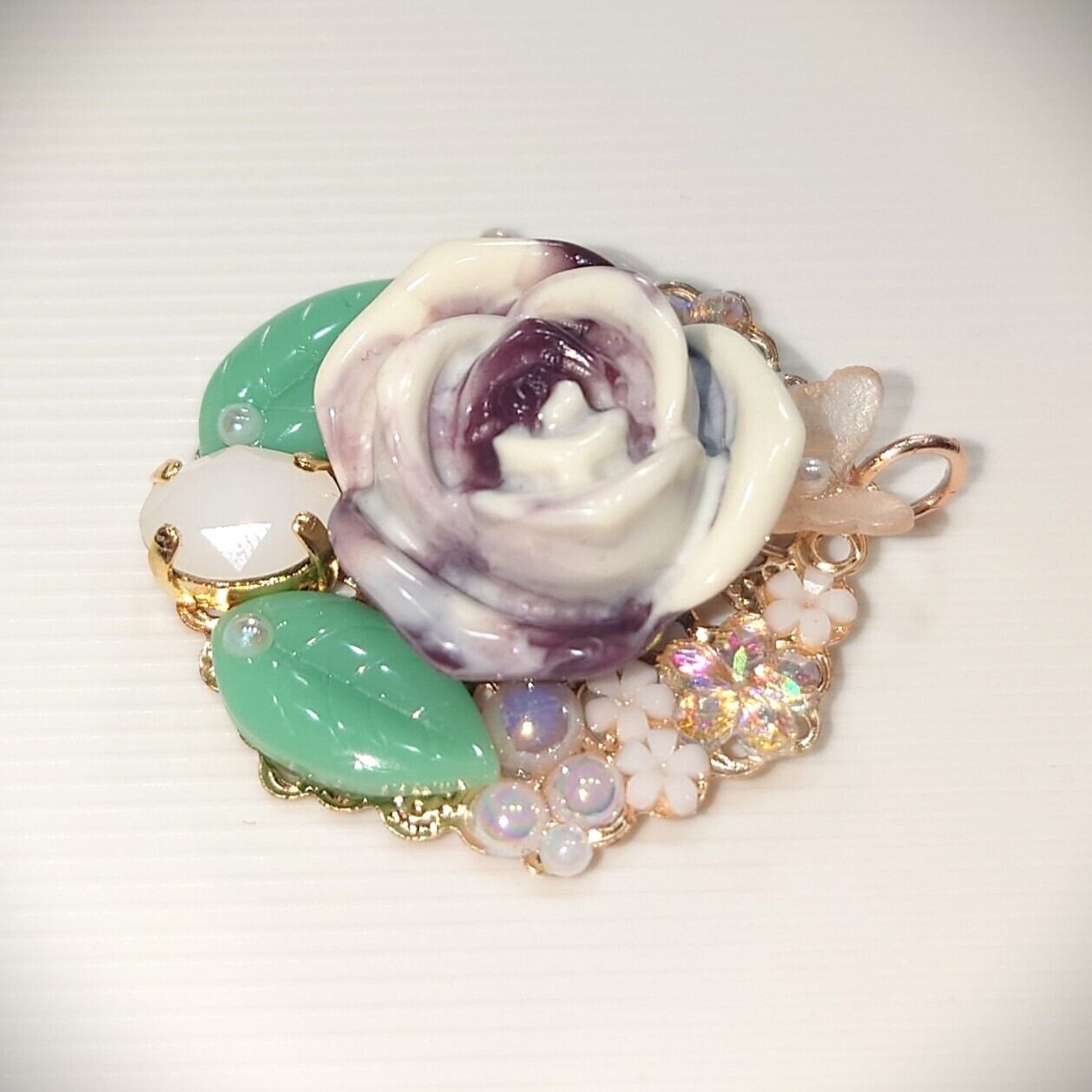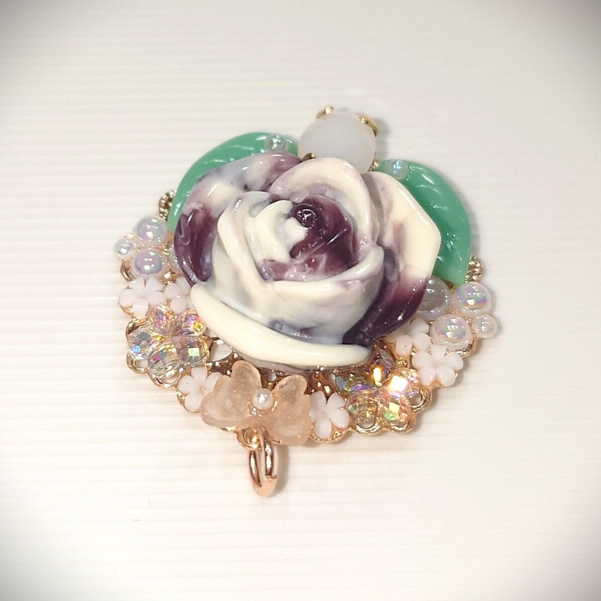 ハンドメイドで作成された、マーブルチョコ色の薔薇を中心にデザインしたペンダントトップです。薔薇のしたにホワイトアラバスター色のクリスタルガラスを配置して落ち着いた色合いにしてみました。